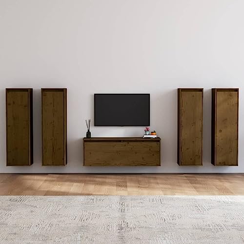 Der AJSEOYBS TV-Tisch ist ein hochwertiger und stilvoller TV-Schrank, der aus massivem Kiefernholz gefertigt ist. Er verfügt über fünf Stücke, die in einem warmen Honigbraunton gehalten sind und somit eine gemütliche Atmosphäre in jedem Raum schaffen. Dieser TV-Tisch eignet sich perfekt für das Wohnzimmer, Schlafzimmer, Büro, Empfangsraum oder Arbeitszimmer und bietet ausreichend Stauraum für Ihre Multimedia-Geräte und Zubehör.