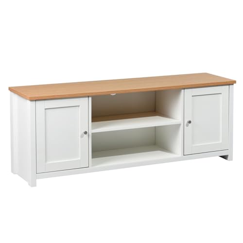 Mit einer Länge von 130 cm bietet der TV-Schrank ausreichend Platz für einen Fernseher sowie für weitere Multimedia-Geräte und Zubehör. Die offenen Fächer und Schubladen bieten ausreichend Stauraum für DVDs, CDs, Spiele und andere Utensilien. Dank der integrierten Kabeldurchführung können Kabel ordentlich verlegt werden, was für eine aufgeräumte Optik sorgt.