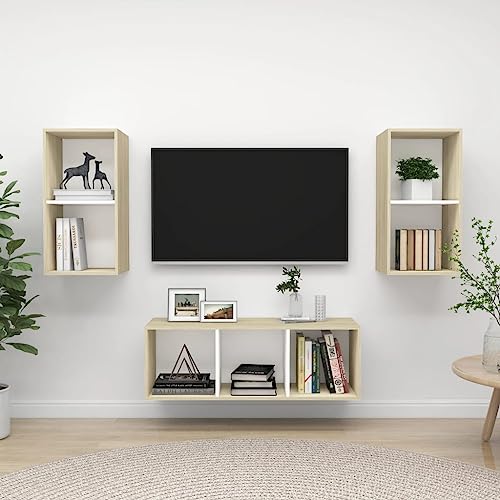 Das 3-teilige TV-Schrank-Set von AUUIJKJF Home Items in Weiß und Sonoma-Eiche ist ein hochwertiges Möbelstück aus Holzwerkstoff, das nicht nur funktional ist, sondern auch stilvoll und modern aussieht. Mit diesem Set können Sie Ihr Wohnzimmer aufwerten und eine elegante Atmosphäre schaffen.