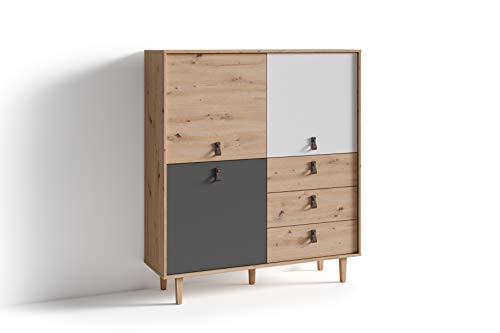 Das byLIVING Highboard BILL ist ein stilvoller Wohnzimmerschrank, der mit seinem modernen Design, seiner hochwertigen Verarbeitung und seiner praktischen Funktionalität überzeugt. Mit ausreichend Stauraum für Ihre persönlichen Gegenstände und einer edlen Optik in Artisan Eiche Optik hellbraun, Weiß und Grau ist das Highboard die ideale Ergänzung für Ihr Zuhause. Durch seine kompakten Maße passt das Möbelstück auch in kleinere Räume und eignet sich daher perfekt für Wohnungen oder Häuser mit begrenztem Platzangebot. Mit dem Highboard BILL schaffen Sie nicht nur Ordnung, sondern auch eine gemütliche und stilvolle Atmosphäre in Ihrem Wohnzimmer.
