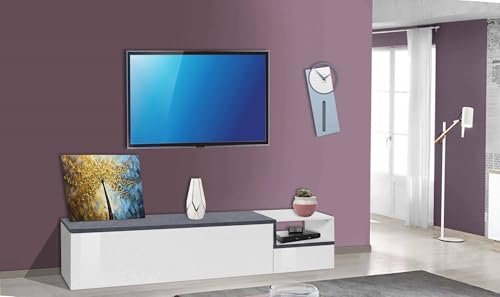 Der TV-Schrank eignet sich nicht nur als Fernsehständer-Basis, sondern auch als dekoratives Element in Ihrem Wohnzimmer. Das glänzende Weiß und Schiefer passt zu vielen Einrichtungsstilen und lässt sich gut mit anderen Möbeln kombinieren. Durch seine schlichte Eleganz wird der TV-Schrank zum Mittelpunkt in Ihrem Wohnzimmer.