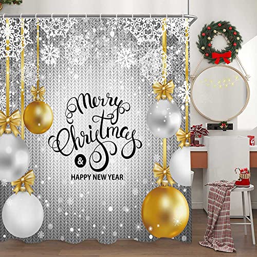 Der DYMH Frohe Weihnachten Duschvorhang ist eine wunderschöne Ergänzung für jedes Badezimmer, um die festliche Stimmung der Weihnachtszeit zu verbreiten. Mit seinem eleganten Design in Gold, Weiß und Silber mit Kugeln, Schneeflocken und gestrickter Wolle ist dieser Duschvorhang perfekt für die Feiertage und den Beginn des neuen Jahres.