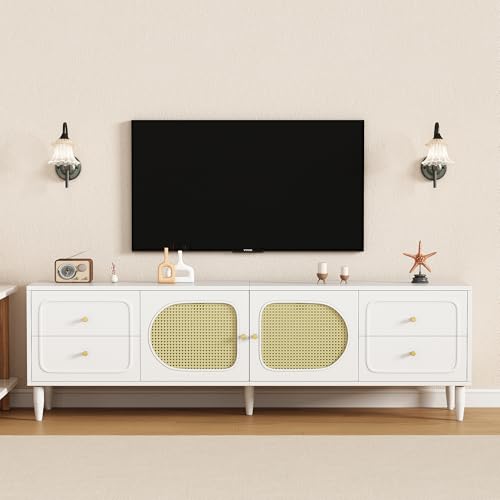 Zusammenfassend ist der elegante Rattan-TV-Schrank mit 4 Schubladen, 2 Rattantüren, höhenverstellbaren Beinen und Kabelmanagement ein vielseitiges und stilvolles Möbelstück, das Ihrem Wohnzimmer einen Hauch von Eleganz verleiht. Mit ausreichend Stauraum für Ihre elektronischen Geräte und eine robuste Konstruktion, die Ihren Fernseher sicher hält, ist dieser TV-Schrank die perfekte Ergänzung für Ihr Zuhause. Gönnen Sie sich dieses hochwertige Möbelstück und verwandeln Sie Ihr Wohnzimmer in einen stilvollen und organisierten Raum, in dem Sie sich entspannen und Ihre Lieblingssendungen genießen können.