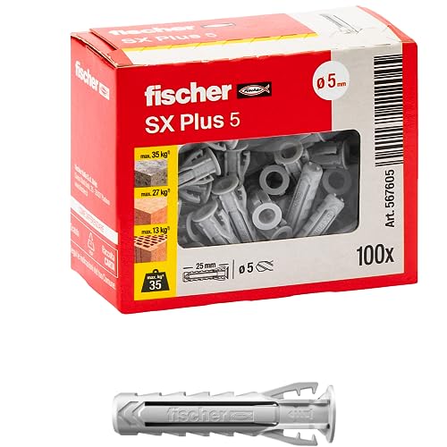 Fischer 100 Dübel SX Plus 5 x 25 mm sind hochwertige Dübel, die sich ideal für die Befestigung von Kronleuchtern, Möbeln, Hängeschränken und Regalen in Vollwänden, Lochziegeln, Mauerwerk und Beton eignen. Mit ihrer hohen Tragkraft und Zuverlässigkeit sind sie die perfekte Lösung für alle Arten von Befestigungsaufgaben im Innen- und Außenbereich.