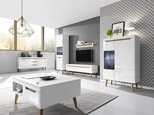 Insgesamt ist das Furniture24 Wohnzimmer Set NORDI eine erstklassige Wahl für alle, die ein stilvolles und modernes Wohnzimmer im skandinavischen Stil gestalten möchten. Mit einer Kommode, Vitrine, Couchtisch, TV-Schrank und Hängeregal bietet das Set eine umfassende Lösung für die Einrichtung des Wohnzimmers und schafft eine harmonische und gemütliche Atmosphäre. Mit hochwertigen Materialien, einem zeitlosen Design und einer sorgfältigen Verarbeitung sind die Möbelstücke des Sets eine Investition in die Zukunft und ein echter Blickfang in jedem Wohnzimmer.