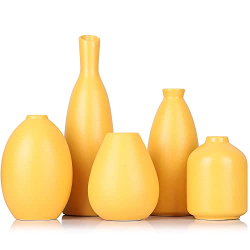 Gelbe Keramik Knospen Vasen Set von 5 sind eine wunderschöne Ergänzung für jedes Zuhause, insbesondere für Liebhaber von Bauernhaus Dekor. Diese Vasen sind perfekt für Kamindekor, Kaminsims und Regal Dekor, sowie für die Heimdekoration in Wohnzimmer, Eingang, Badezimmer und Büro. Sie eignen sich auch hervorragend als Couchtischdekoration und sind in Bulk erhältlich, was bedeutet, dass Sie eine Vielzahl von Möglichkeiten haben, um Ihr Zuhause zu verschönern.