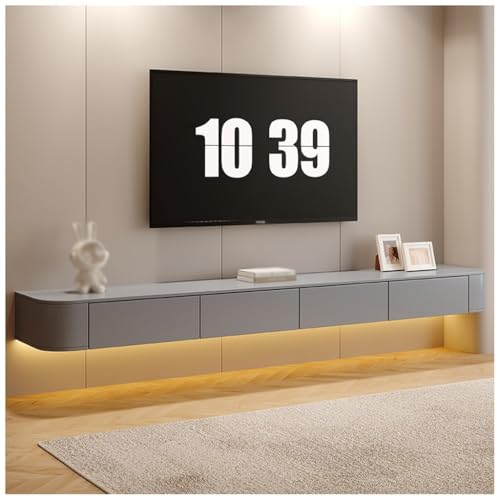 Ein weiterer Vorteil dieses TV-Aufbewahrungsschranks ist die integrierte Tür, die es ermöglicht, den Fernseher und das Zubehör bei Bedarf diskret zu verstauen. Dadurch wirkt der Raum aufgeräumt und ordentlich, ohne dass die Technik im Vordergrund steht. Die schwebende TV-Einheit sorgt zudem für einen schwebenden Effekt, der den Raum größer und luftiger wirken lässt.