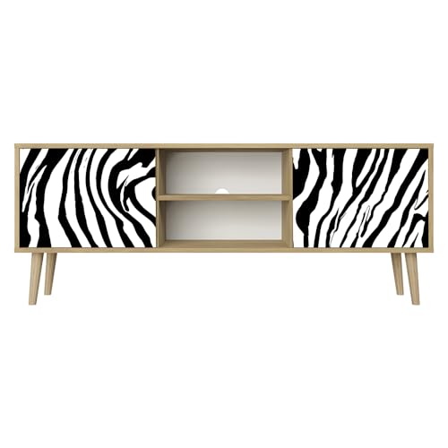Der TV Schrank verfügt über zwei Türen, hinter denen sich großzügiger Stauraum verbirgt. Hier können DVDs, CDs, Fernbedienungen oder andere Wohnaccessoires ordentlich verstaut werden, sodass das Wohnzimmer stets aufgeräumt und ordentlich wirkt. Zudem bietet der Schrank auch offene Fächer, in denen elektronische Geräte wie Receiver oder Spielkonsolen untergebracht werden können.