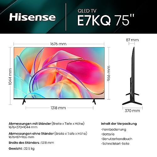 Der Hisense 75E7KQ QLED Smart TV ist ein beeindruckendes Stück Technologie, das mit einer Bildschirmdiagonale von 189 cm (75 Zoll) jeden Raum zum Leben erweckt. Mit einer 4K-Auflösung und HDR10, HDR10+ decoding, sowie HLG und Dolby Vision Unterstützung liefert dieser Fernseher gestochen scharfe Bilder und lebendige Farben, die jeden Filmabend zu einem Erlebnis machen.