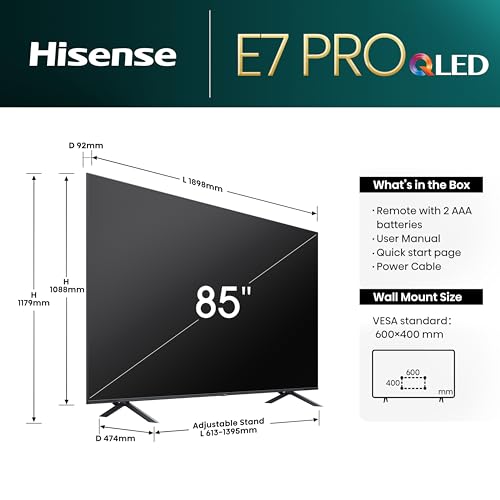 Hisense ist ein renommierter Hersteller von Unterhaltungselektronik und hat mit dem Hisense 85E7NQ Pro einen beeindruckenden 85-Zoll-Fernseher auf den Markt gebracht. Dieses Modell bietet eine erstklassige Bildqualität dank der 4K UHD-Auflösung und der QLED-Technologie. Mit einer Bildschirmdiagonale von 215 cm ist der Hisense 85E7NQ Pro perfekt für ein immersives Heimkinoerlebnis.