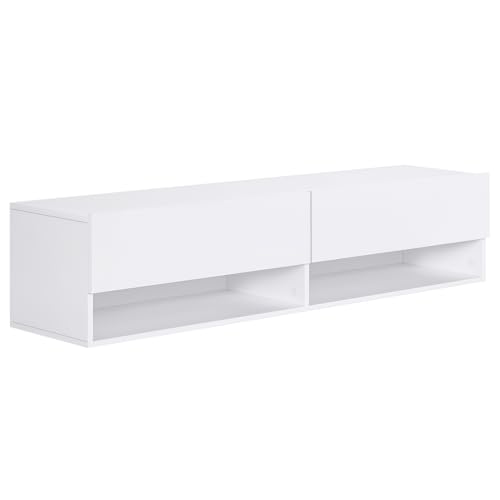 Das Design des HOMCOM TV Schranks ist schlicht und zeitlos, sodass er zu vielen Einrichtungsstilen passt. Durch die schwebende Optik wirkt er besonders modern und elegant und setzt deinen Fernseher gekonnt in Szene. Die Klappfächer bieten Platz für Geräte wie DVD-Player oder Receiver, während die offenen Regale genügend Raum für Bücher, Dekoartikel oder weitere Multimedia-Geräte bieten.