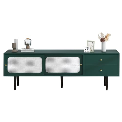 Der TV-Schrank besteht aus hochwertigen Materialien, die für Langlebigkeit und Stabilität sorgen. Das robuste Holz sorgt für eine solide Konstruktion, während die Kunststoff-Rattan-Schiebetüren dem Schrank einen modernen Look verleihen. Das Grün des Schranks ist frisch und modern und passt gut zu einer Vielzahl von Einrichtungsstilen.