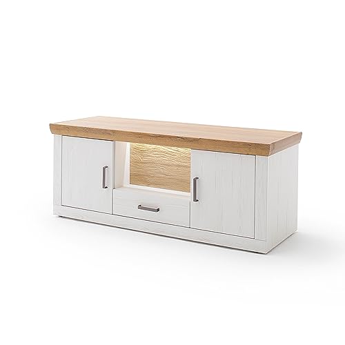 Das Lomadox TV-Lowboard 154 breit mit offenem Fach und LED Beleuchtung in Pinie weiß mit Eiche Nb. ist ein hochwertiges Möbelstück im Landhausstil, das sich perfekt als TV Schrank, TV Board, Fernsehschrank oder Fernsehtisch eignet. Mit seinen Maßen von ca. 154/62/50 cm bietet es genügend Platz für Ihren Fernseher sowie weiteres Zubehör.