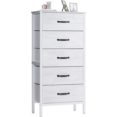 Die Kommode verfügt über 5 geräumige Stoffschubladen, die genügend Platz bieten, um Ihre Kleidung, Bücher, Dokumente oder andere Gegenstände ordentlich zu verstauen. Die Schubladen sind mit Griffen ausgestattet, die das Öffnen und Schließen erleichtern und ein elegantes Design verleihen.