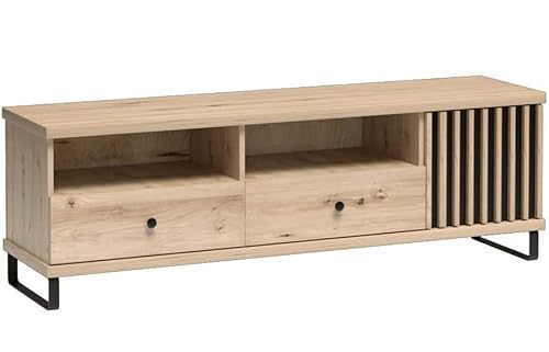 Mit seinen großzügigen Maßen bietet der Marmex Cali 06b viel Platz für Ihre Multimedia-Geräte und sorgt gleichzeitig für Ordnung im Wohnzimmer. Die Kombination aus Eiche Artisan und Schwarz Matt passt zu vielen Einrichtungsstilen und sorgt für eine moderne Atmosphäre. Die Lamellenfront verleiht dem TV-Schrank eine interessante Optik und macht ihn zu einem Blickfang in Ihrem Wohnzimmer.