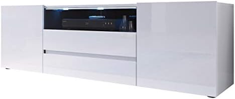 Das TV Lowboard ist in einem eleganten Weiß gehalten, das durch hochglänzende Akzente zusätzlich aufgewertet wird. Diese Kombination verleiht dem Möbelstück eine edle und moderne Ausstrahlung, die sich perfekt in moderne Wohnräume einfügt.