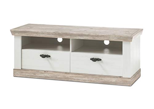Das TV Lowboard besticht durch sein klassisches Landhausdesign in Pinie Weiß, das für eine gemütliche und warme Atmosphäre in Ihrem Zuhause sorgt. Die hochwertige Verarbeitung und die robuste Konstruktion aus MDF sorgen für Stabilität und Langlebigkeit. Die Pinie Weiß Oberfläche verleiht dem Möbelstück eine natürliche Optik und passt perfekt zu verschiedenen Einrichtungsstilen.