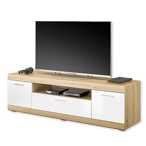 Das NOLA TV-Lowboard in Artisan Eiche Optik und Weiß Hochglanz ist ein moderner TV Schrank, der Ihrem Wohnzimmer einen eleganten und zeitgemäßen Look verleiht. Mit Maßen von 165 x 49 x 43 cm (B/H/T) bietet dieses Möbelstück viel Stauraum für Ihre TV-Geräte, DVDs, Spielekonsolen und mehr.