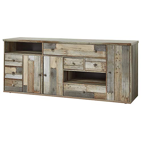 Das Sideboard besticht durch sein einzigartiges Design in Driftwood Optik, das an verwittertes Holz erinnert. Diese Optik verleiht dem Möbelstück einen rustikalen Charme und macht es zu einem Blickfang in jedem Raum. Die Vintage-Optik des Sideboards lässt sich wunderbar mit verschiedenen Einrichtungsstilen kombinieren und sorgt für ein gemütliches Ambiente.