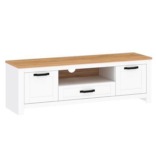 Das Lowboard besteht aus einer Schublade und zwei Türen, die in einem zeitlosen Weiß mit Eiche Kraft Gold Optik gehalten sind. Diese Farbkombination verleiht dem Möbelstück eine edle und ansprechende Optik, die sich nahtlos in jede Einrichtung einfügt. Die Maße des Lowboards betragen 163x45x53cm, was ausreichend Platz für Ihren Fernseher, DVD-Player, Spielkonsolen und andere Multimedia-Geräte bietet.