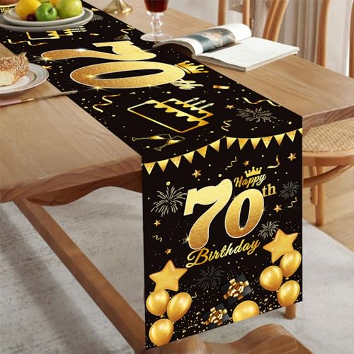 Der Tischläufer ist in den klassischen Farben Schwarz und Gold gehalten, die eine elegante und festliche Atmosphäre schaffen. Das goldene „Happy 70th Birthday“ Schriftzug verleiht dem Tischläufer eine persönliche Note und macht ihn zu einem besonderen Highlight auf jeder Geburtstagsfeier. Mit einer Größe von 180×35 cm passt der Tischläufer perfekt auf die meisten Esstische und eignet sich sowohl für den Innen- als auch für den Außenbereich.