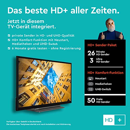 Ein besonderes Highlight des Toshiba 32LK3C63DAY ist die 6-monatige HD+ inklusive. Mit HD+ erhalten Sie Zugriff auf eine Vielzahl von HD-Sendern und exklusiven Inhalten in gestochen scharfer Bildqualität. Dadurch erleben Sie Fernsehen in einer neuen Dimension und verpassen keine Details mehr.