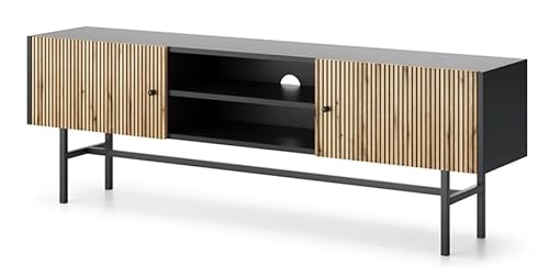 Das Lowboard bietet nicht nur Platz für Ihren Fernseher, sondern auch für andere Multimedia-Geräte wie DVD-Player, Spielkonsolen und Stereoanlagen. Die Nischen im Schrank bieten zusätzlichen Stauraum für DVDs, CDs, Bücher und andere Utensilien. Dank der Lamellentüren können Sie die Nischen leicht öffnen und schließen, während Ihr Equipment vor Staub und neugierigen Blicken geschützt ist.