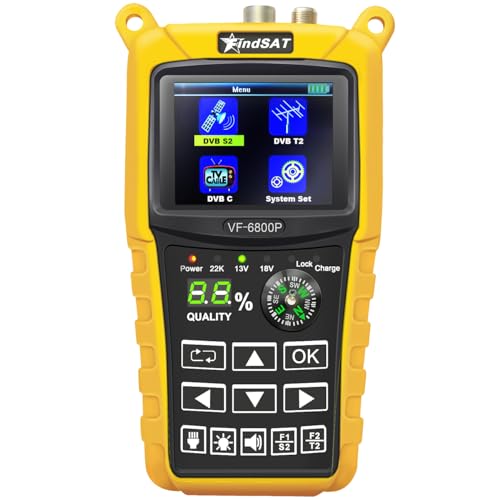 Der VF6800P Sat Finder ist ein vielseitiges und leistungsstarkes Messgerät, das speziell für die Ausrichtung von Satellitenschüsseln und die Suche nach Satellitensignalen entwickelt wurde. Mit diesem Gerät können Sie Satelliten-Signale für DVB-S/S2 (SAT), DVB-T/T2 (Terrestrisch H.265) und DVB-C (Kabel) empfangen und überprüfen. Es ist ein unverzichtbares Werkzeug für alle, die eine Satellitenschüssel installieren oder ausrichten möchten.