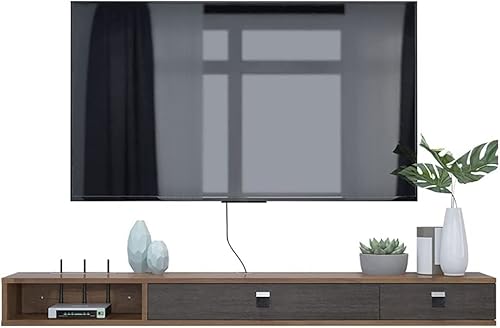 Ein wandhängender TV-Schrank ist eine praktische und platzsparende Lösung für das Wohnzimmer. Mit einem schwebenden Regal und einem an der Wand montierten TV-Ständer können Sie Ihre Set-Top-Box, Satelliten-TV-Box und Kabelbox stilvoll und ordentlich verstauen. Das Aufbewahrungsregal für Komponenten bietet ausreichend Platz für alle Ihre Geräte und sorgt für eine aufgeräumte Wohnzimmerumgebung.