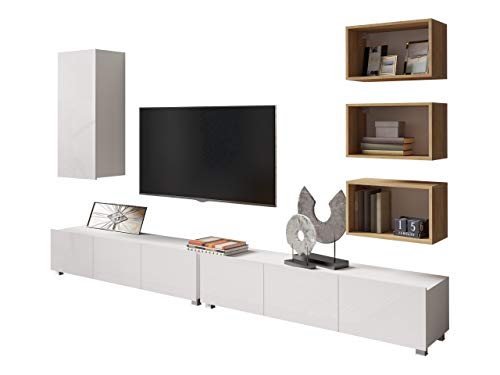 Die Wohnwand Calabrini XXXVI ist ein modernes und elegantes Wohnzimmer-Set, das aus verschiedenen Elementen besteht, darunter Mediawand, Anbauwand, 2 TV Schränke, Hängeschrank, 3 Wandregale und Wohnzimmerschrank. Das Set ist in den Farben Weiß und Weiß Hochglanz mit Akzenten in Eiche Gold erhältlich, was ihm einen edlen und zeitgemäßen Look verleiht.