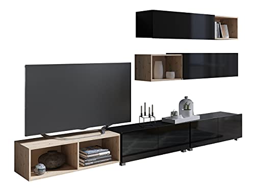 Das Wohnzimmer-Set Calabrini XXV ist eine moderne und elegante Lösung für die Gestaltung Ihres Wohnzimmers. Die Wohnwand besteht aus einem Anbauwand Fernsehschrank, einer Mediawand, einem Hängeschrank, einem TV Schrank, zwei Wandregalen und einem Wohnzimmerschrank, alle in den Farben Schwarz/Schwarz Hochglanz und Eiche Artisan gehalten.