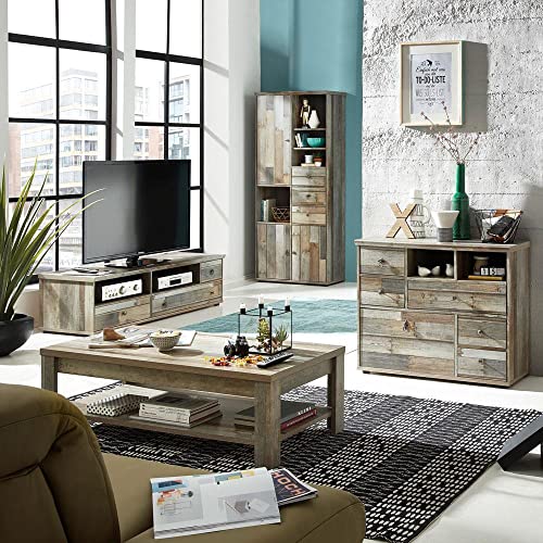 Das Wohnzimmerset umfasst in der Regel einen Couchtisch, ein TV-Lowboard, einen Schrank und eine Kommode, die alle im gleichen Vintage Driftwood-Stil gestaltet sind. Diese Möbelstücke sind in der Regel aus robustem Holz gefertigt und verfügen über rustikale Details wie abgenutzte Oberflächen, Metallbeschläge und natürliche Holzmaserungen, die ihnen einen authentischen Vintage-Look verleihen.