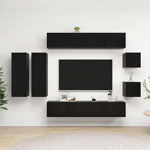 Das YUHI-HQYD 8-TLG. TV-Schrank-Set ist die perfekte Lösung für alle, die ihr Wohnzimmer, ihre Küche oder ihre Eingangshalle stilvoll und funktional gestalten möchten. Dieses Set besteht aus verschiedenen Hängeschränken, Aufbewahrungsschränken, einem Multifunktions-Schrank, einem Multimedia-Schrank, TV-Möbeln und einer TV-Wand, die alle aus hochwertigem Schwarz Holzwerkstoff gefertigt sind.